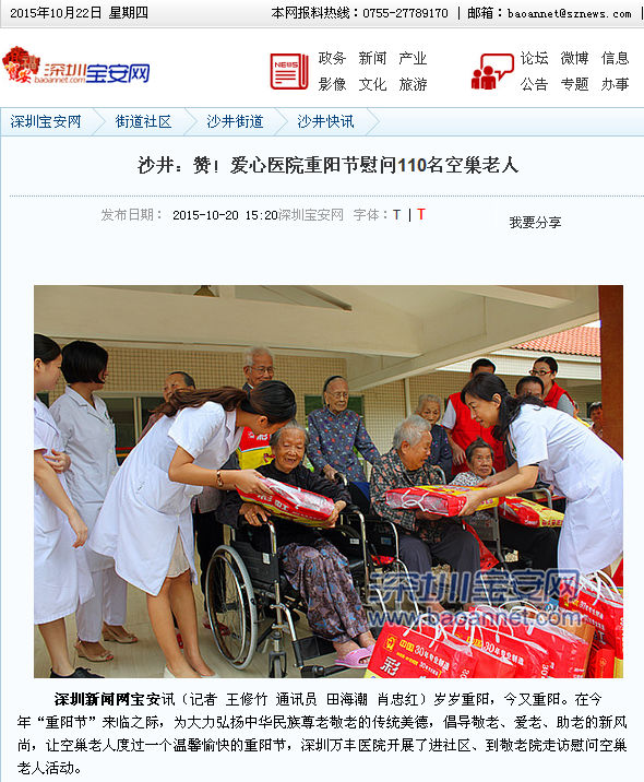 “深圳宝安网”“2015年10月20日报道了沙井“赞!爱心医院重阳节慰问110名空巢老人”的新闻。