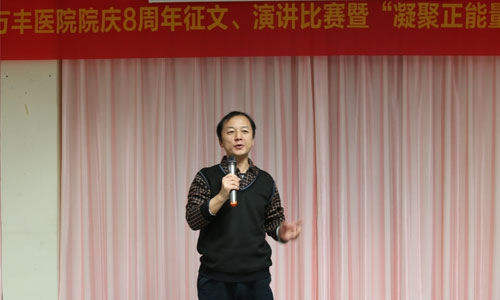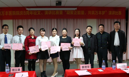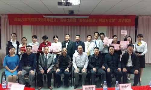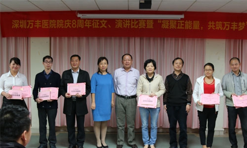为增强深圳万丰医院全院员工的主人翁意识,促使员工始终把自身的发展与医院的发展紧密地联系在一起,将“个人梦”融入到“万丰梦”,2015年11月27日深圳万丰医院特举办院庆8周年有奖征文、演讲比赛。本次比赛中全院各个科室积极报名,踊跃参与。市民广场片区党总支书记周强、华一实验学校德育办主任林方飞、著名作家、评论家唐小林,沙井街道办干部胡立潮、深圳万丰医院廖贤平院长及院内其他领导共9人作为大赛评委,与深圳万丰医院100余名员工一起观看了本次比赛。