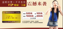 深圳万丰医院以“万丰关爱基金大行动”为主题,在深圳关爱行动公益基金会的支持下,首次推出VIP健康一卡通,预存500元送100元,预存1000元送200元,以此类推。美容科、产科、针炙推拿科推出多项增值服务,关爱患者健康,让患者享受尊贵医疗服务。