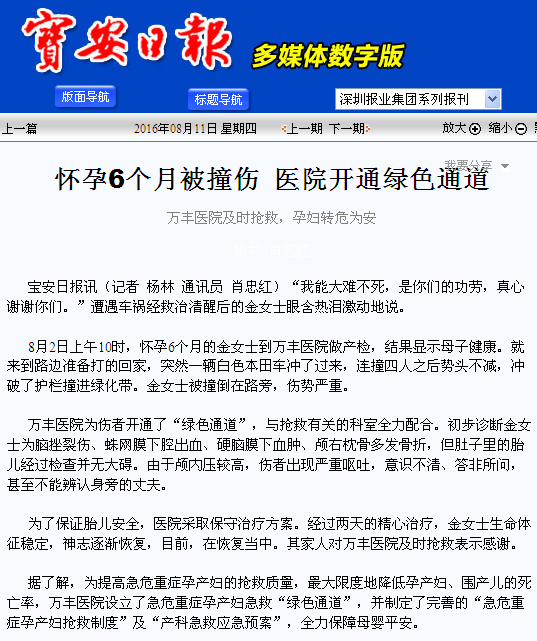 2016年8月11日,宝安日报在第A05“融和”版块,对深圳万丰医院开通绿色通道及时抢救被撞伤孕妇让孕妇转危为安的事件,以“怀孕6个月被撞伤 医院开通绿色通道 万丰医院及时抢救 孕妇转危为安”的标题进行了报道。