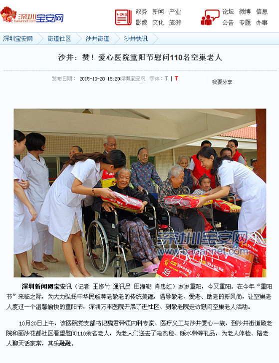 “老吾老以及人之老”,常怀爱老敬老之情,是我们中华民族的美德。多年来,深圳万丰医院弘扬优秀传统文化,崇孝尚德,每年的重阳节都组织系列活动,把“敬老、爱老、助老”作为永恒的主题,丰富了院内外老年人的生活,加深了彼此间的感情,增添了节日的喜庆气氛,让老年人真切地感受到医院的温暖与关怀。