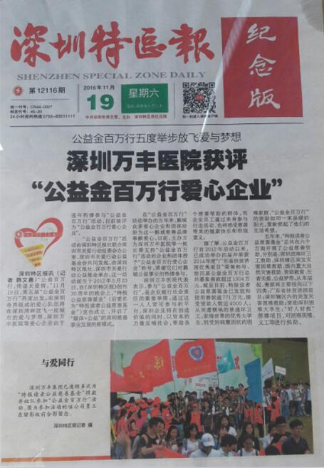 11月19日,第五届“公益百万行”再度出发。深圳万丰医院等爱心企业由于连年热情参与“公益百万行”活动,日前被评为“公益百万行爱心企业”。深圳特区报于11月19日以“深圳万丰医院获评‘公益金百万行爱心企业’”标题对此进行了报道。