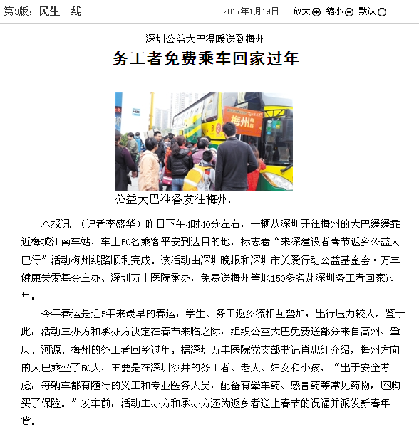 深圳晚报和深圳市关爱行动公益基金会·万丰健康关爱基金主办、深圳万丰医院承办免费返乡大巴,乘车务工人员在2017年1月20日安全平安到家。深圳晚报于2017年1月20日第3版:民生一线对“深圳公益大巴温暖送到梅州务工者免费乘车回家过年 ” 为标题对此进行了新闻报道。