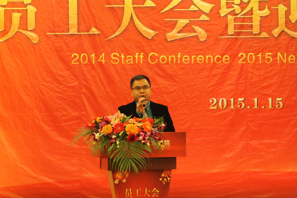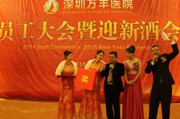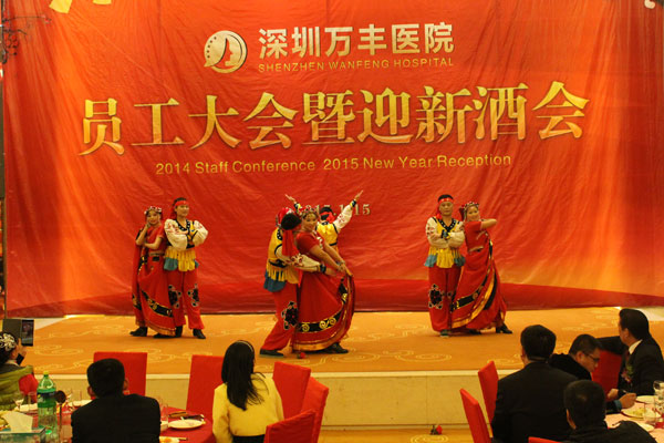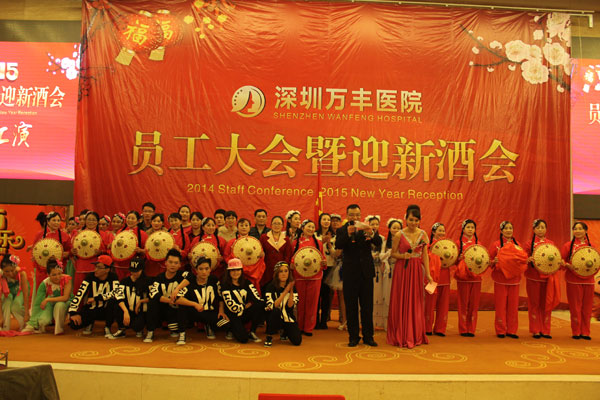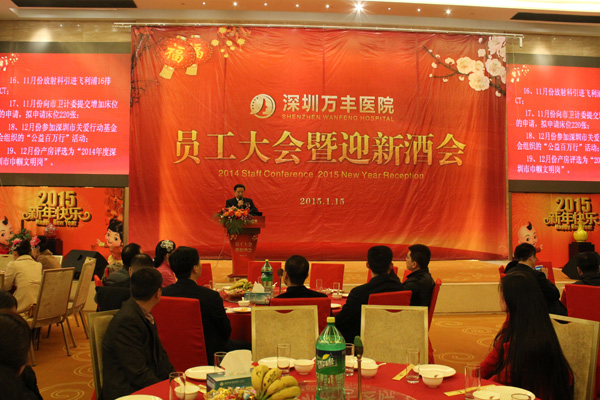 晚会由员工大会和迎新酒会两部分组成,员工大会上首先播放了医院宣传片,全体员工合唱院歌,由深圳万丰医院钟院长对2014年工作进行总结,并且展望2015年,寄语新的一年有更好的业绩。