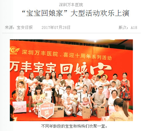 日前,由深圳万丰医院主办的大型亲子类主题——“万丰宝宝回娘家”公益活动,在中天美景华美达酒店欢乐上演,来自深圳的300多个家庭参与了这一盛会。随着二胎政策的放开,越来越多的宝宝在深圳万丰医院呱呱坠地。据悉,本次活动是深圳万丰医院“十年奋进 砥砺同行”10周年院庆活动的一部分。【宝安日报】以“宝宝回娘家”大型活动欢乐上演 为标题对此进行了报道。
