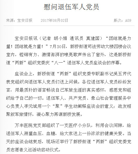 万丰医院党支部组织了一支医疗小分队,给退伍军人测量血压、血糖,给大家送上一份浓浓的健康关爱。7月30日,新桥街道司法劳动大楼四楼会议室内,铿锵有力、激情澎湃的嘹亮歌声传出了窗外,这是新桥街道“两新”组织党委庆“八一”退伍军人党员座谈会的序幕。【宝安日报】以“万丰医院慰问退伍军人党员”为标题对此进行了报道。