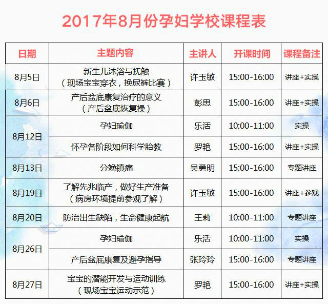 深圳万丰医院孕妇学校8月课程新鲜出炉