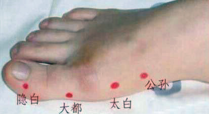 取穴:取坐位,在足大趾与足掌所构成的关节(第1跖趾关节)后下方掌背交界线处可触及一凹陷,按压有酸胀感