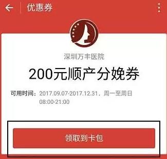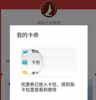 1、关注深圳万丰医院微信(szwfyy),点击自定义菜单【微信卡券】的【微信卡券】弹出一条图文消息。