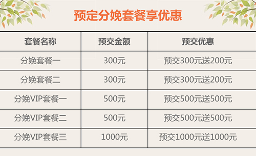 活动当天预定以下套餐,就可享受相应的优惠,在分娩时就可以狠狠省下一笔银子啦!