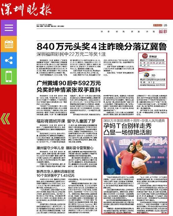 近日,由深圳万丰医院主办的“感恩十周年·孕美人风尚盛典”优雅揭幕,20位怀孕6个月以上的孕妈妈依次走上T台,她们优雅的孕装,婀娜的身姿引得观众鼓掌、惊叹。深圳晚报9月27日A25版以“孕妈T台别样走秀 凸显一场惊艳活剧”为标题进行了新闻报道。