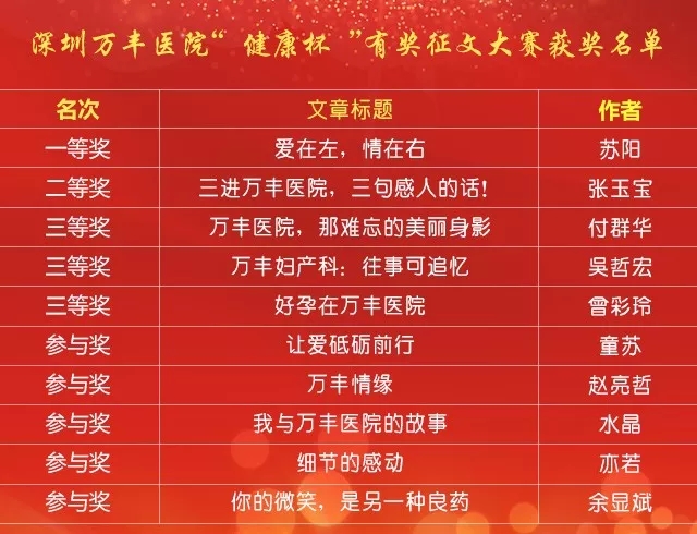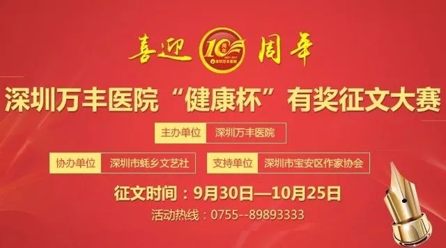 喜讯!深圳万丰医院建院10周年举办的“健康杯”有奖征文大赛评选结果揭晓啦。本次活动由深圳万丰医院主办,深圳市蚝乡文艺社协办,深圳市宝安区作家协会全力支持。