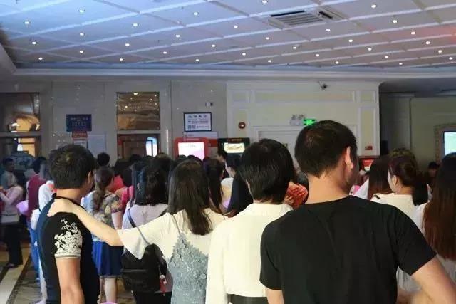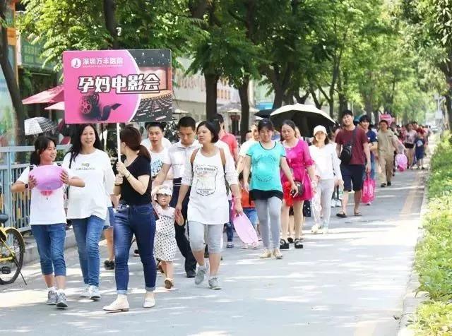 ▲在准爸陪同下,孕妈们排队领取电影票