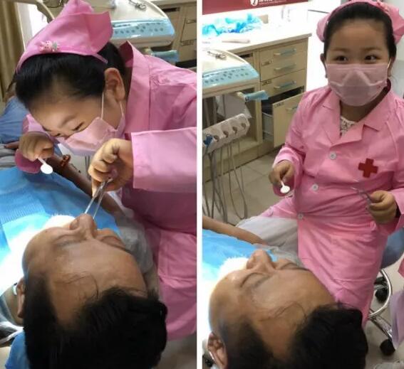 ▲“小牙医”帮父母做口腔检查