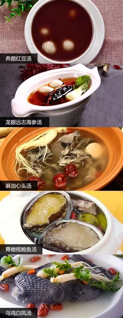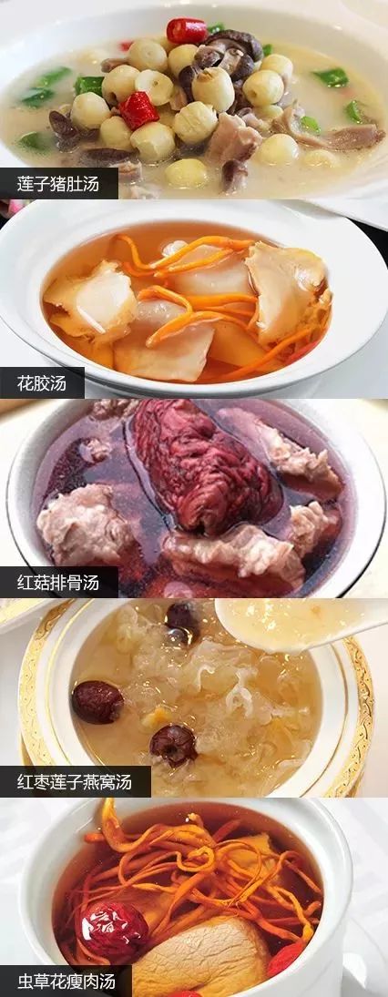 龙眼远志海参汤、青橄榄鲍鱼汤、虫草花瘦肉汤、麻油心头汤、红枣莲子燕窝汤、养颜红豆汤、莲子猪肚汤、乌鸡白凤汤、花胶汤、红菇排骨汤。