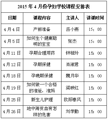 深圳万丰医院2015年4月份孕妇学校课程表